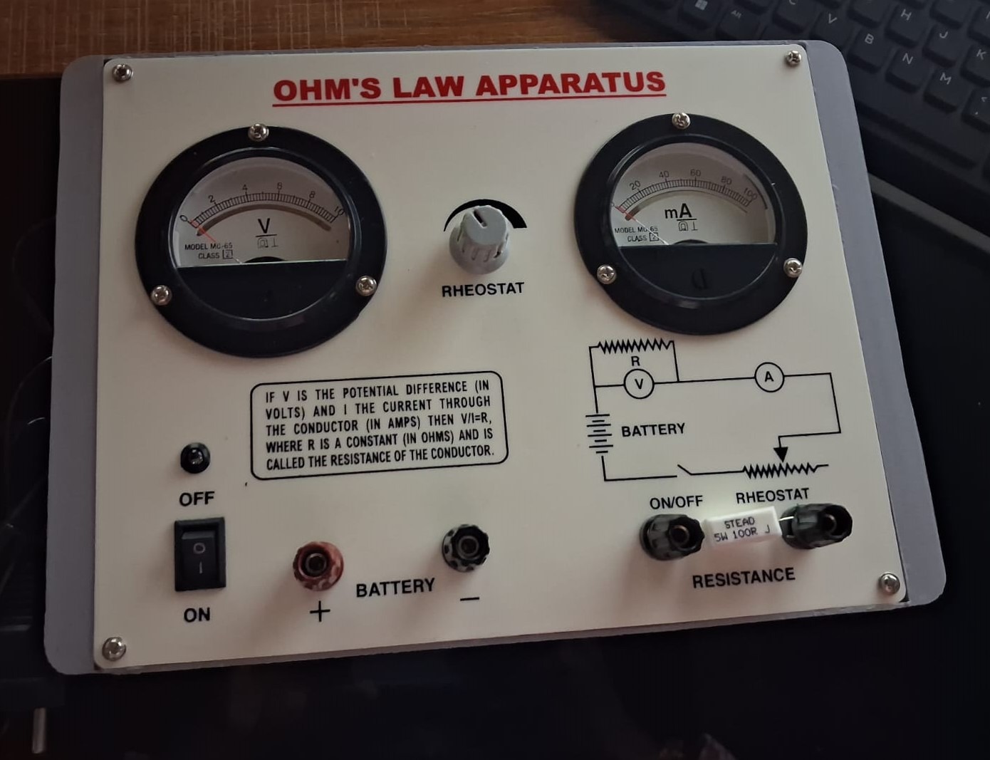 OHMS LAW APPARATUS DESCRIPTION Ohm’s Law Apparatus is a laboratory setup used to verify Ohm’s Law, which states that the current through a conductor is directly proportional to the applied voltage at constant temperature. It includes a DC power supply, voltmeter, ammeter, rheostat, resistance coil, switch, and connecting wires. By measuring voltage and current, students can confirm the relationship between V, I, and R.