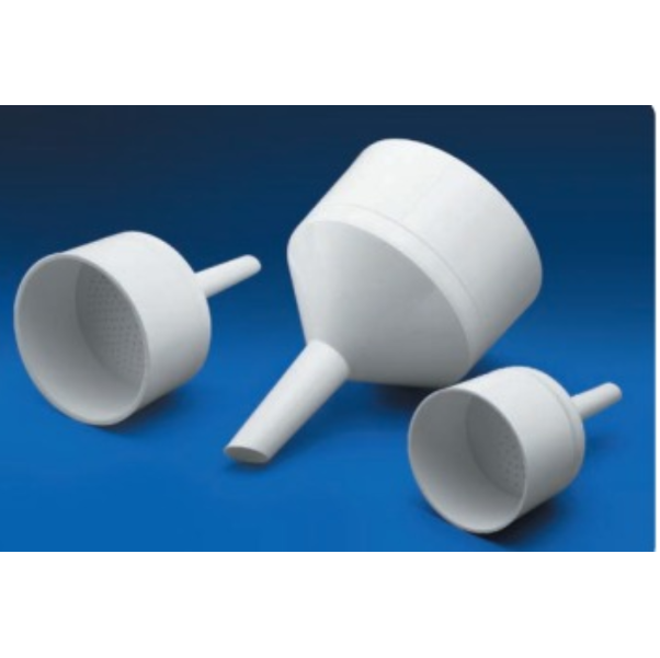 PL The Buchner Funnel is a laboratory filtration apparatus used for vacuum (suction) filtration. It is typically made of porcelain or high-quality plastic and features a flat, perforated plate where filter paper is placed. The funnel is used along with a vacuum flask to quickly separate solids from liquids. Its design allows uniform filtration and efficient removal of moisture from precipitates. The Buchner Funnel is durable, chemical-resistant, and widely used in chemistry laboratories for rapid and effective filtration processes.